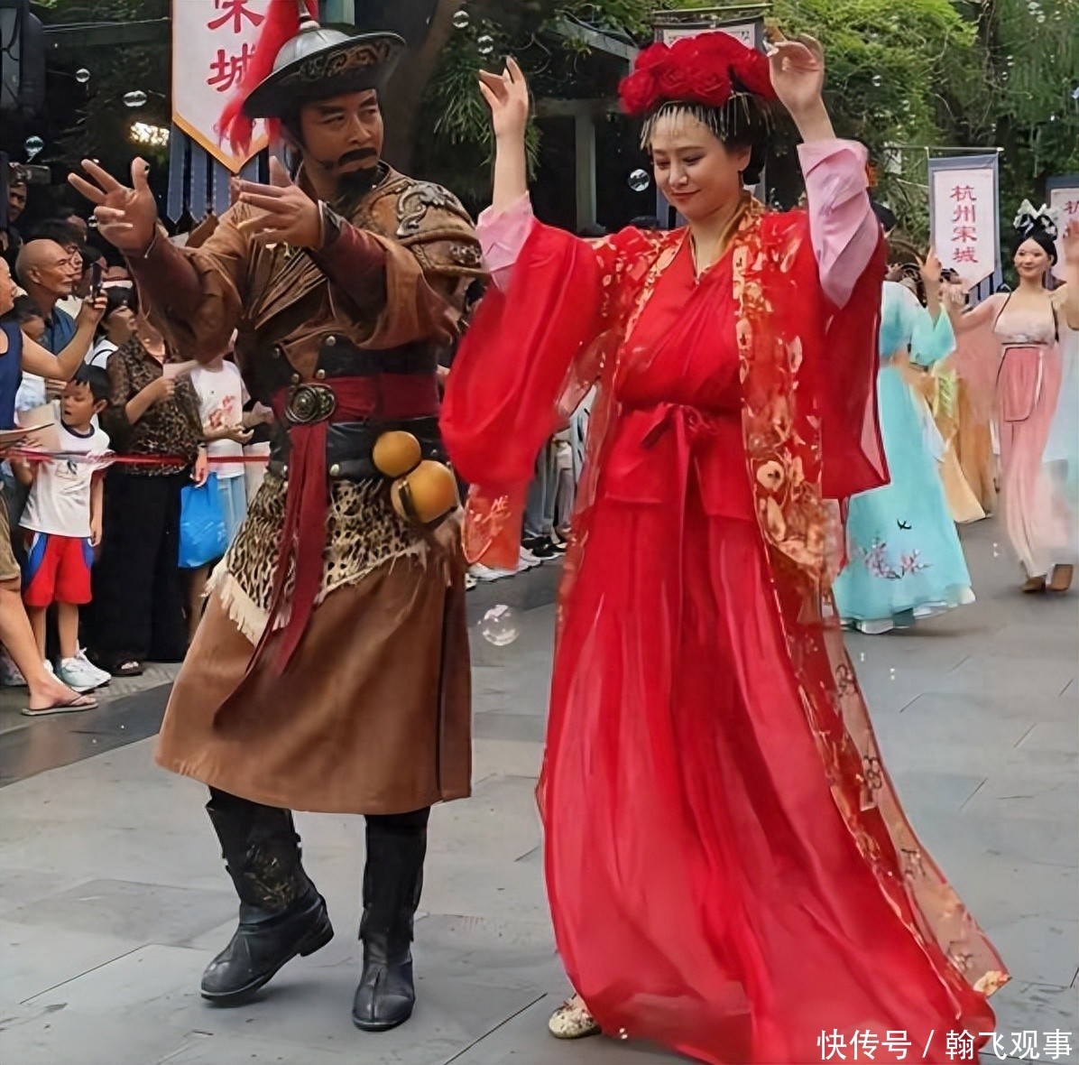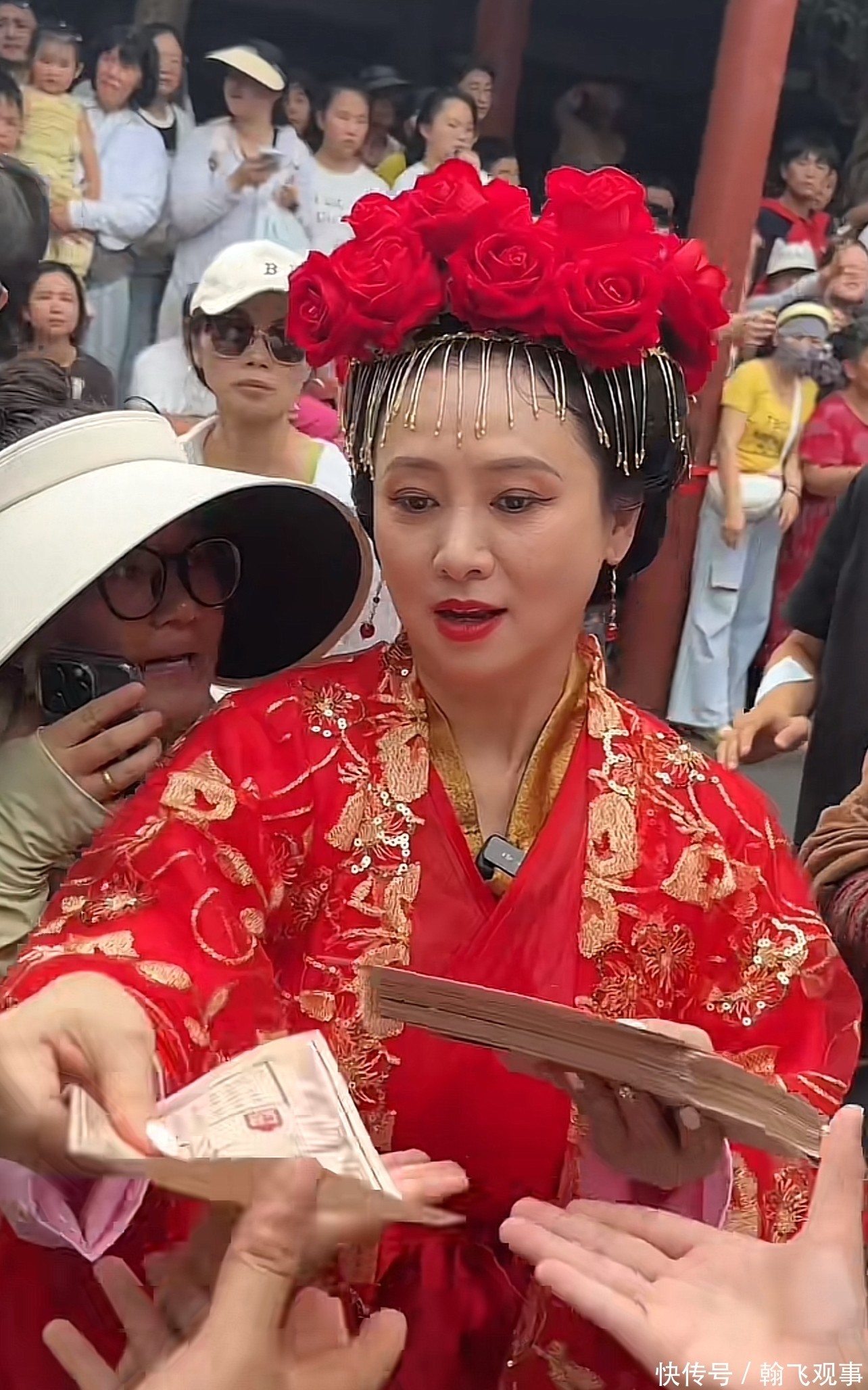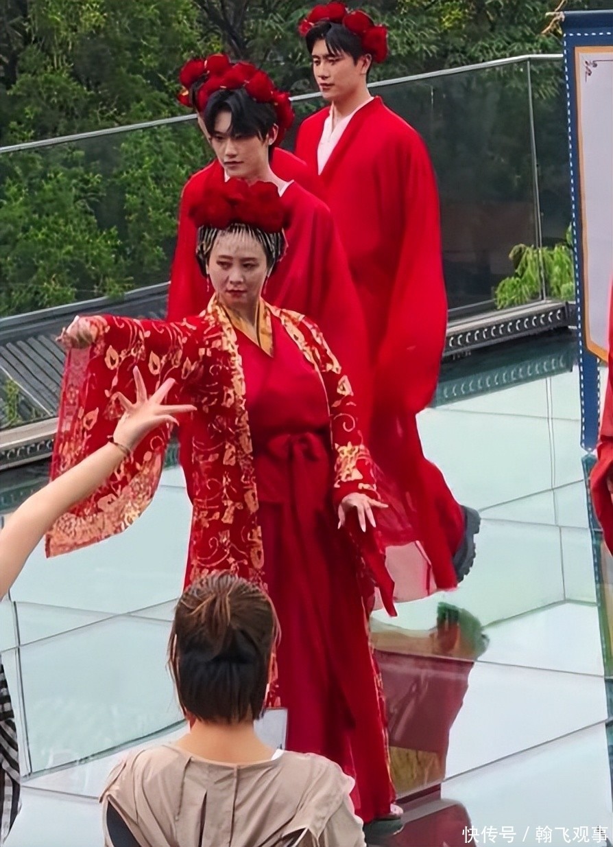 8月11日,翁虹穿戴孤單大紅色長裙,頭上戴著精細的玫瑰花冠,在景區露天舞臺上賣力扮演。